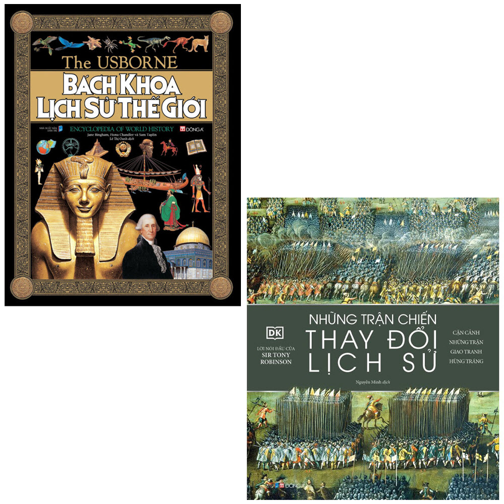 Combo 2 cuốn: Bách khoa lịch sử thế giới + Những trận chiến thay đổi lịch sử. Sách do Công ty Cổ phần Văn hóa Đông A và NXB Dân trí liên kết ấn hành. Hình thức: Bìa cứng, có bìa áo, in màu toàn bộ.
