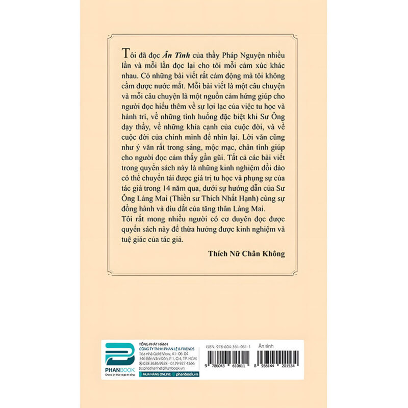 Thông qua những câu chuyện giản dị nhưng đầy sức gợi, Ân Tình giúp người đọc nhìn lại các mối quan hệ đã nuôi dưỡng mình, từ tình thầy trò, gia đình, tăng thân cho đến những ân duyên lặng lẽ trong đời sống hằng ngày. Đây là cuốn sách phù hợp để đọc chậm, đọc lại nhiều lần, như một người bạn tinh thần đồng hành cùng người đọc trên hành trình tìm kiếm sự an trú, chữa lành và sống có ý thức hơn trong thế giới nhiều xao động.