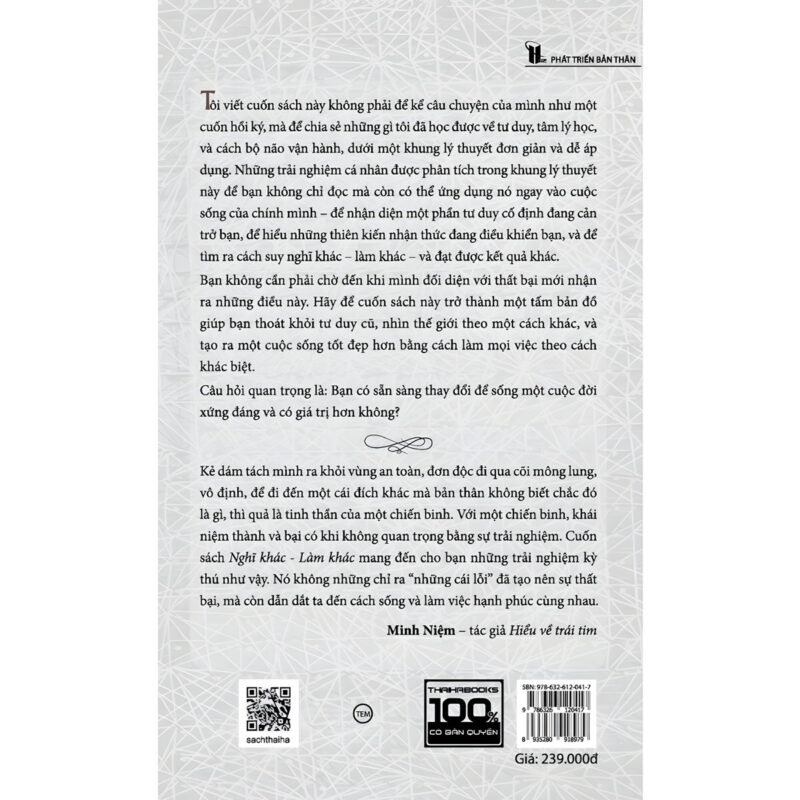Sách nghĩ khác – làm khác – bí quyết thay đổi tư duy ra đời như một lời mời gọi người đọc quay về quan sát chính cách mình suy nghĩ, ra quyết định và hành động. Được dẫn dắt bằng câu chuyện trải nghiệm thật của tác giả, kết hợp giữa chiêm nghiệm cá nhân và phân tích tâm lý học, cuốn sách mang tinh thần gần với các tác phẩm thuộc sách nhân vật & nghệ thuật, nơi tư duy được soi chiếu qua đời sống nội tâm và hành trình trưởng thành của con người. Tác phẩm không hứa hẹn thành công nhanh chóng, cũng không đưa ra những khẩu hiệu sáo rỗng, mà mở ra con đường thay đổi bền vững từ gốc rễ nhận thức.