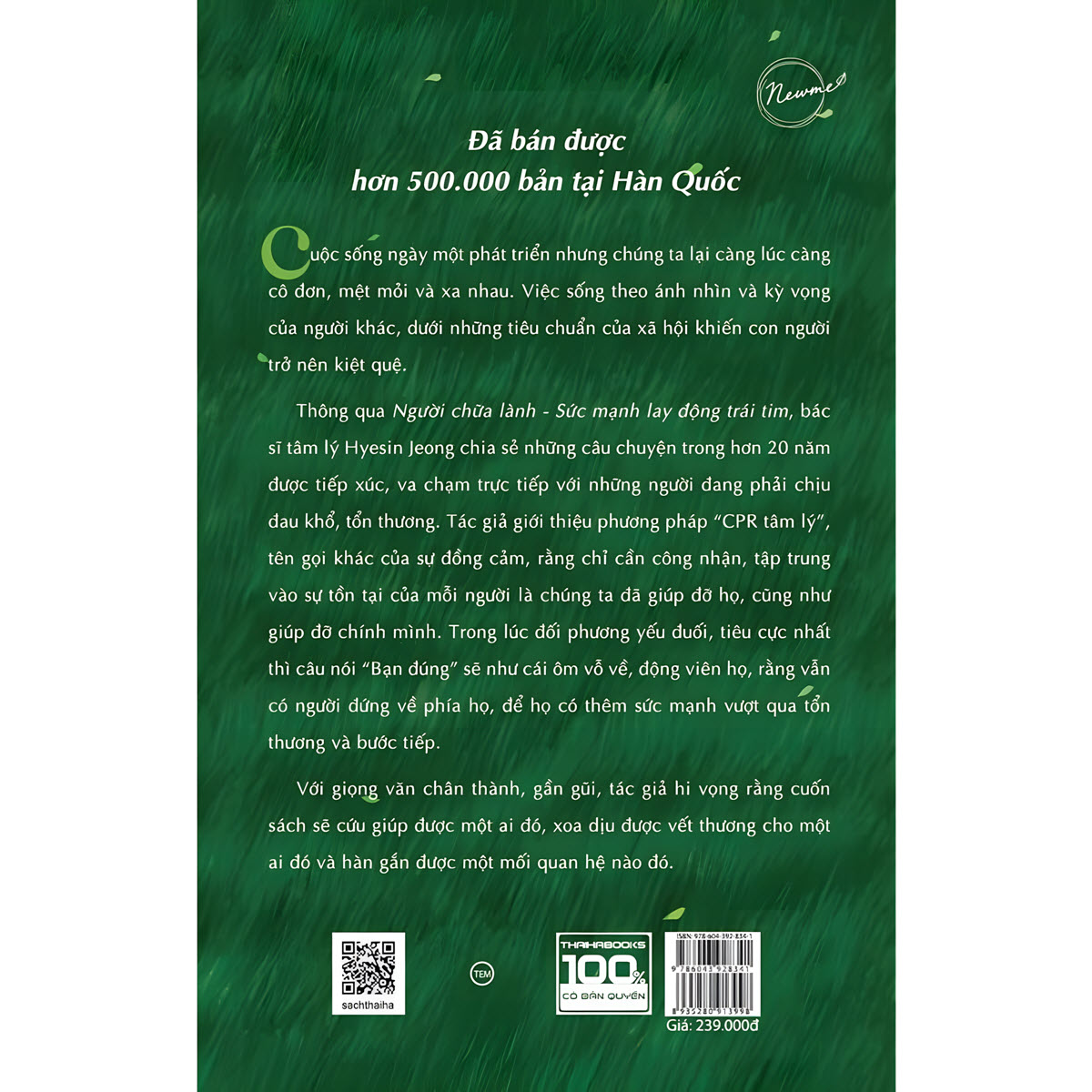Sách người chữa lành không ra đời từ bàn viết, mà được chưng cất từ hơn 20 năm trực tiếp trị liệu, tiếp xúc và đồng hành cùng những con người mang trong mình tổn thương tinh thần sâu sắc. Với kinh nghiệm lâu năm trong lĩnh vực tâm lý học lâm sàng, Hyesin Jeong nhận ra rằng rất nhiều nỗi đau của con người không thể được xoa dịu chỉ bằng chẩn đoán, tiêu chuẩn hay thuốc men.