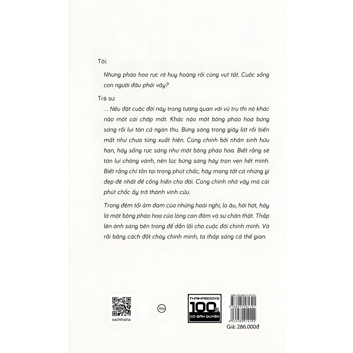 Không mang tính giáo điều hay áp đặt, sách lựa chọn cách kể chuyện chậm rãi, dung dị. Từng trang viết giống như một thước phim tua chậm, nơi mỗi suy tư, trăn trở của con người hiện đại được soi chiếu bằng sự thấu hiểu và lòng từ bi. Hình ảnh “bông pháo hoa” trở thành ẩn dụ xuyên suốt cho kiếp người hữu hạn: dù chỉ bừng sáng trong khoảnh khắc, nhưng nếu sống trọn vẹn, ánh sáng ấy vẫn đủ để thắp lên hy vọng và ý nghĩa cho chính mình và cho người khác.