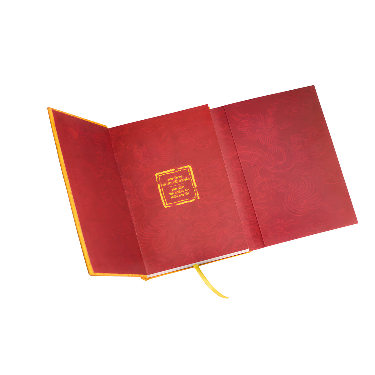 Nếu ấn bản sơn mài nghiêng về vẻ đẹp đời sống, thì ấn bản họa tiết rồng thêu trên vải gấm mang rõ tinh thần của triều đại và lịch sử. Rồng trong mỹ thuật truyền thống Việt Nam là biểu tượng của quyền uy, trật tự và chiều sâu văn hóa hoàng gia. Việc lựa chọn họa tiết rồng cho ấn bản này không mang tính trang trí thuần túy, mà là một cách định vị tinh thần cho cuốn sách.